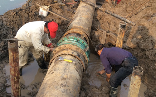 經實地勘查,因支撐土層被挖空后塌陷,造成近60米長的DN500供水主管分節脫落,真武鎮油田管轄區范圍大面積停水,幾萬群眾的正常生產、生活用水受到影響,情況十分緊急。區自來水公司協助油田水廠根據現場情況,以最大程度縮短搶修時間、及早恢復供水為目標,綜合分析比對各種施工方法,科學制定了維修方案,并協助安排接水點,供油田消防車應急送水。經過相關施工準備后,搶修人員按照既定方案,迅速投入維修作業,組織對脫落的管道進行退拔,采用平承平插工藝對脫落的供水管道進行重新定位、碰接。搶修人員頂著烈日連續作戰,于下午5:00左右順利完成施工,使當地供水得到及早恢復。