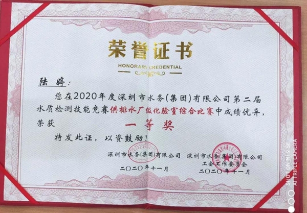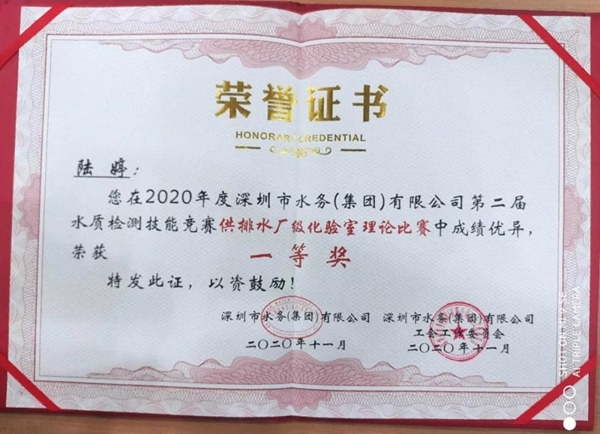 揚州龍川水務公司在深圳水務集團第二屆水質檢測技能競賽中斬獲嘉獎